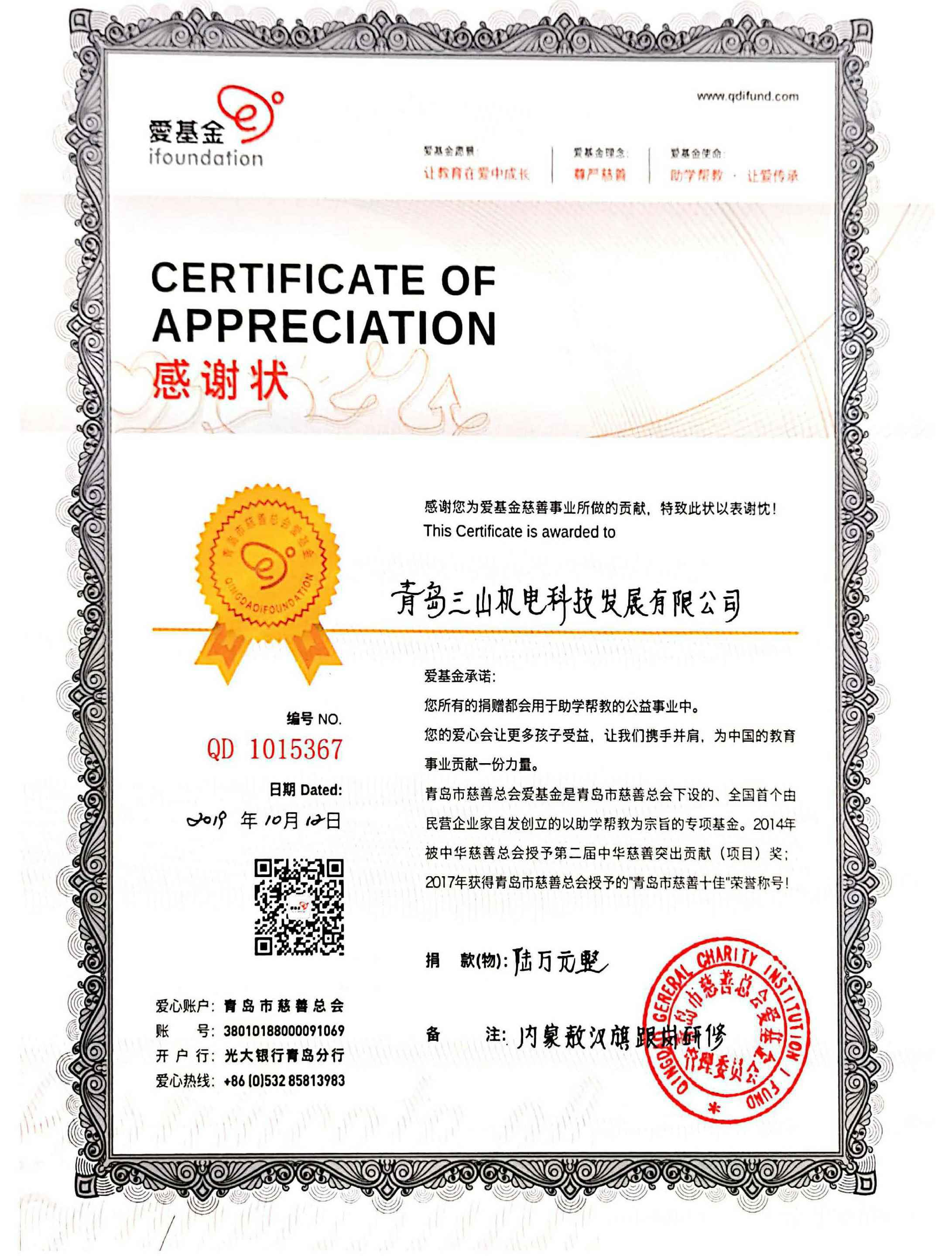 2019年2月,公司公司本着让更多的孩子受到更优质的教育,向“青岛市慈善总会-爱基金管理委员会”捐款人民币50000元整,扶持“定向爱心助学助教项目”,为中国的教育事业贡献一份力量。