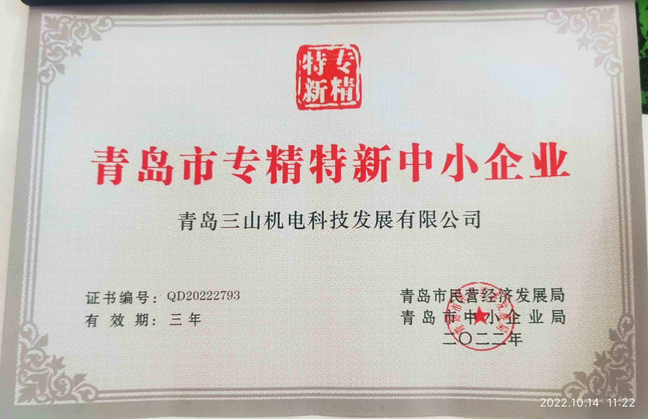 2022年1月,公司机电以高强的研发创新能力、高质量产品和高效的生产能力,第3次获取了“青岛市“专精特新”企业”,由青岛市民营经济发展局和青岛市中心小企业局颁发资质证书。